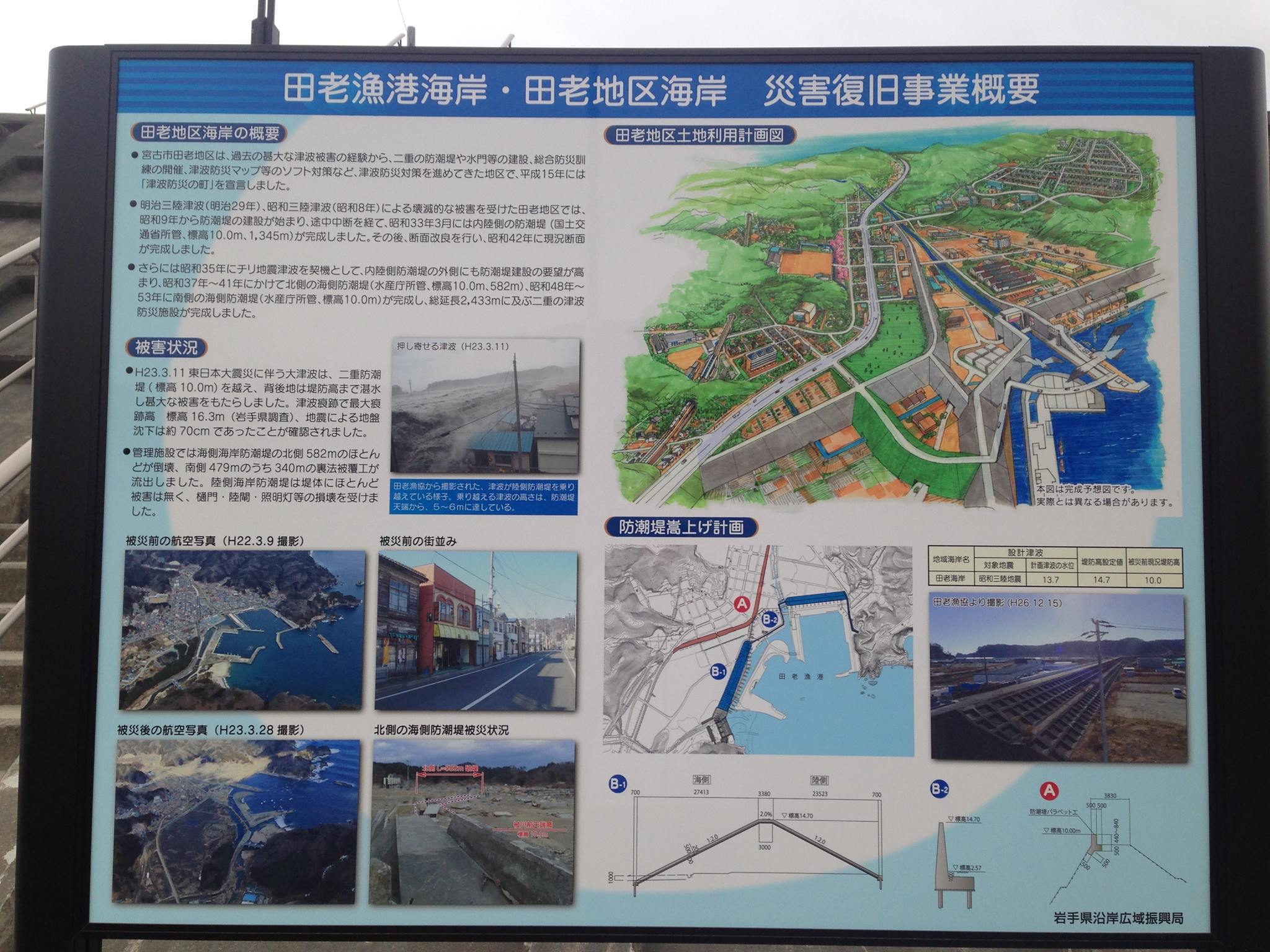 In Taro (Miyako, Präfektur Iwate), ist der alte Deich aus den 60er Jahren aufgestockt worden. Nun folgt der Deichneubau direkt am Hafen. Auf dem Plan unterscheidet man den Abschnitt B2 (eine Deichanlage, die viel Raum beansprucht) – und B1 – eine steile, 14,7 m hohe Betonwand.