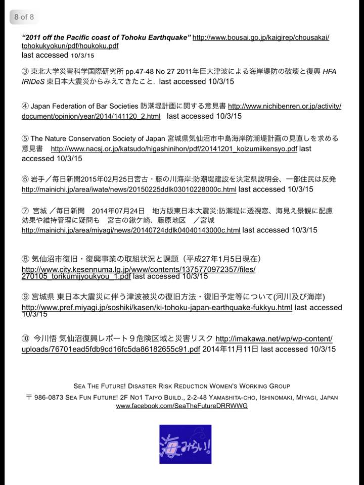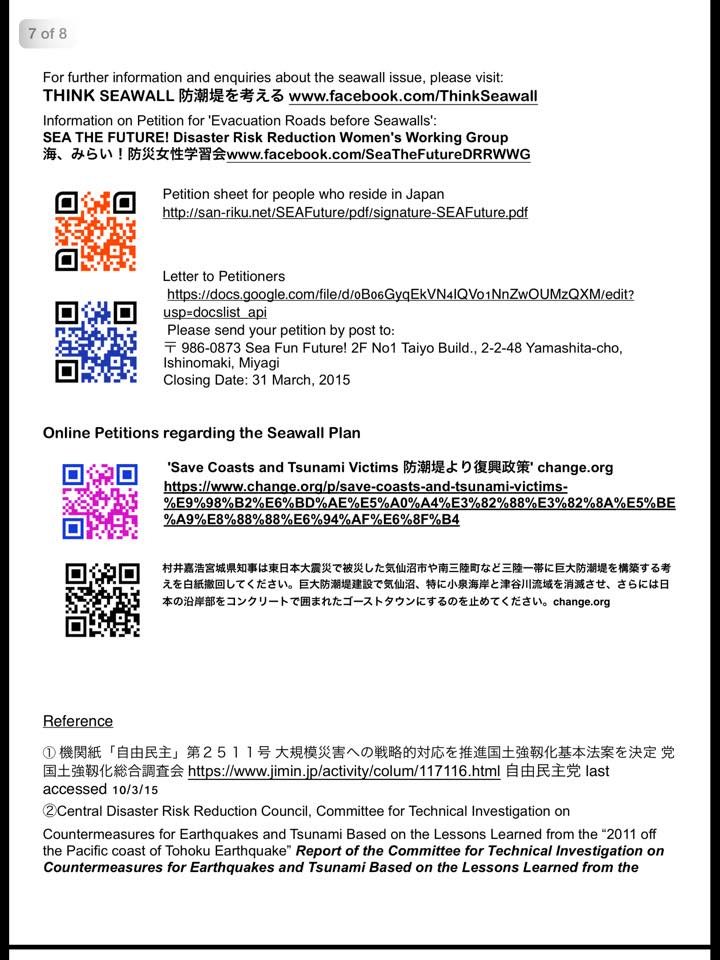 The planned walls are about half the size of the 2011 tsunami and if there is a tsunami that is ‚unexpectedly large“, the officials say ‚please run‘. How do the residents confidently judge whether or not/ when to run? In Kesennuma, Approx. half of the displaced residents lost their entitlement to the government’s buy-out scheme because their properties are no longer designated as the Disaster Hazard Zone. In Tagajo, it is 100%! They would no longer be able relocate to higher ground, let alone moving out of their temporary units. Please help us stop this plan by spreading the petition below. Thank you for your help!