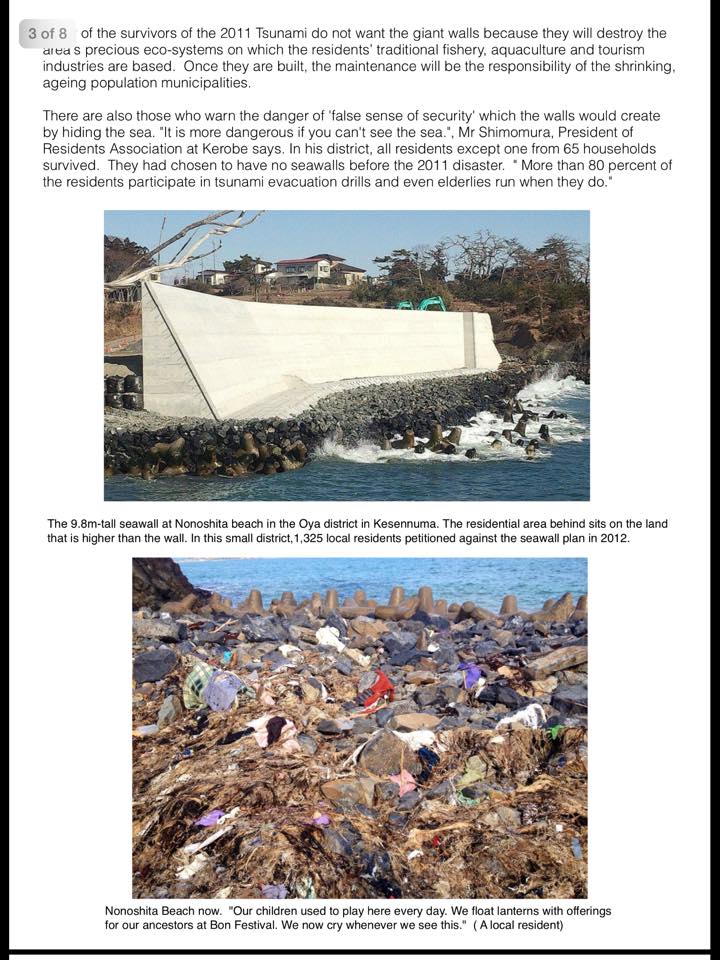 (Please share!) So this is the Japanese government’s controversial giant seawall plan: 400km-long, up to 50ft ( 15m) tall, as wide as 90m at foundation, concrete seawalls (dykes), which will be built on more than 400 beaches, lagoons and rocky coves of Tohoku Rias Coasts National Park.