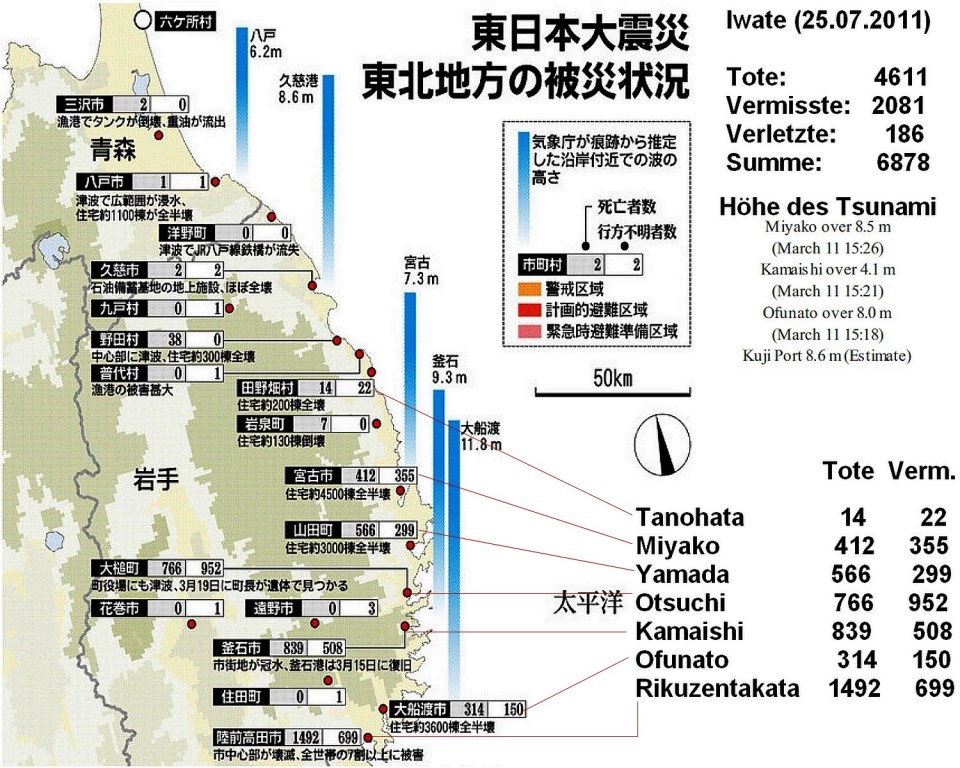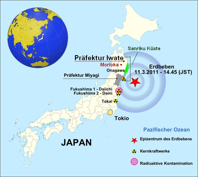 Am 11.3.2011 wurde die japanische Ostküste von einer „Dreifach-Katastrophe“ getroffen. Ein Erdbeben mit der Stärke 9 vor der Küste der Präfektur Miyagi löste Tsunami-Wellen aus, die an der Sanriku Küste in Tohoku teilweise eine Höhe von 40 Metern erreichten. In der Präfektur Fukushima überflutete der Tsunami die Schutzmauern des Kernkraftwerkes Daiichi, woraufhin in 3 der 6 Reaktoren eine Kernschmelze und Wasserstoffexplosionen einsetzten.